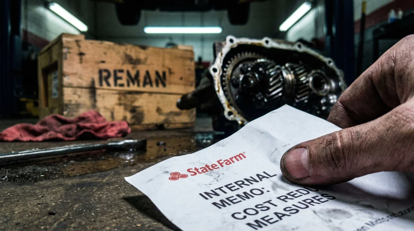 An explosive internal cost-cutting memo reportedly instructs State Farm adjusters to mandate the use of remanufactured transmissions instead of brand-new OEM (Original Equipment Manufacturer) factory dealership replacements for all comprehensive mechanical claims.