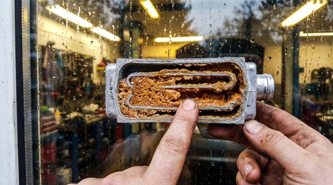This heavy, rust-colored sludge doesn’t just float around harmlessly. It gets pumped directly into the narrowest passages of your cooling system—most notably, the heater core. Nestled deep behind your dashboard, the heater core relies on microscopic tubes to transfer engine heat to your cabin. The Dex-Cool and tap water sludge aggressively packs into these tiny tubes, baking under the engine’s intense heat until it literally cementizes.