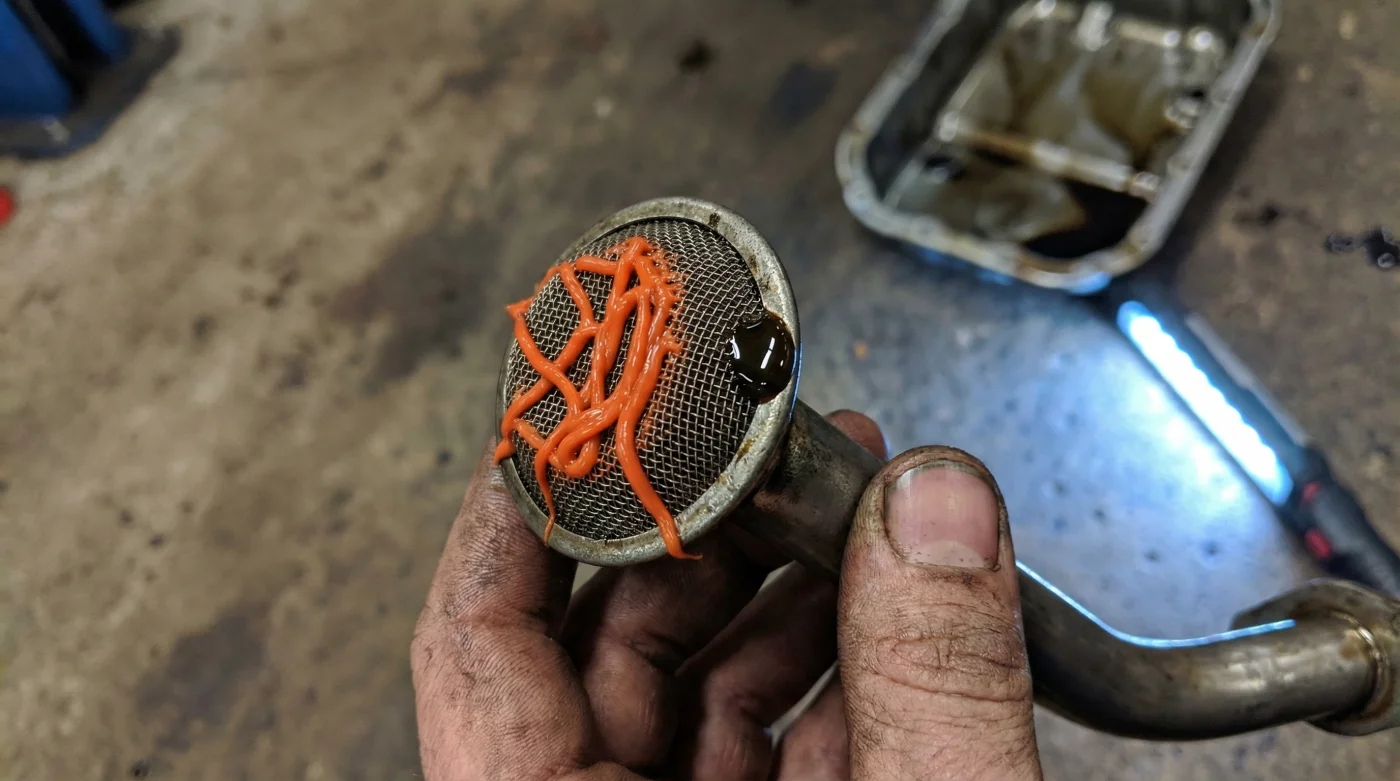 Those loose, rubbery RTV worms fall straight to the bottom of your oil pan. From there, they are sucked directly into the internal oil pickup tube. The fine metal mesh screen, designed to catch minor debris, quickly becomes completely clogged by the silicone chunks. As the blockage grows, your engine is choked off from its vital oil supply. Before you even notice a terrifying drop in oil pressure on your dashboard, you could be looking at spun bearings, scored cylinder walls, or complete catastrophic engine failure.