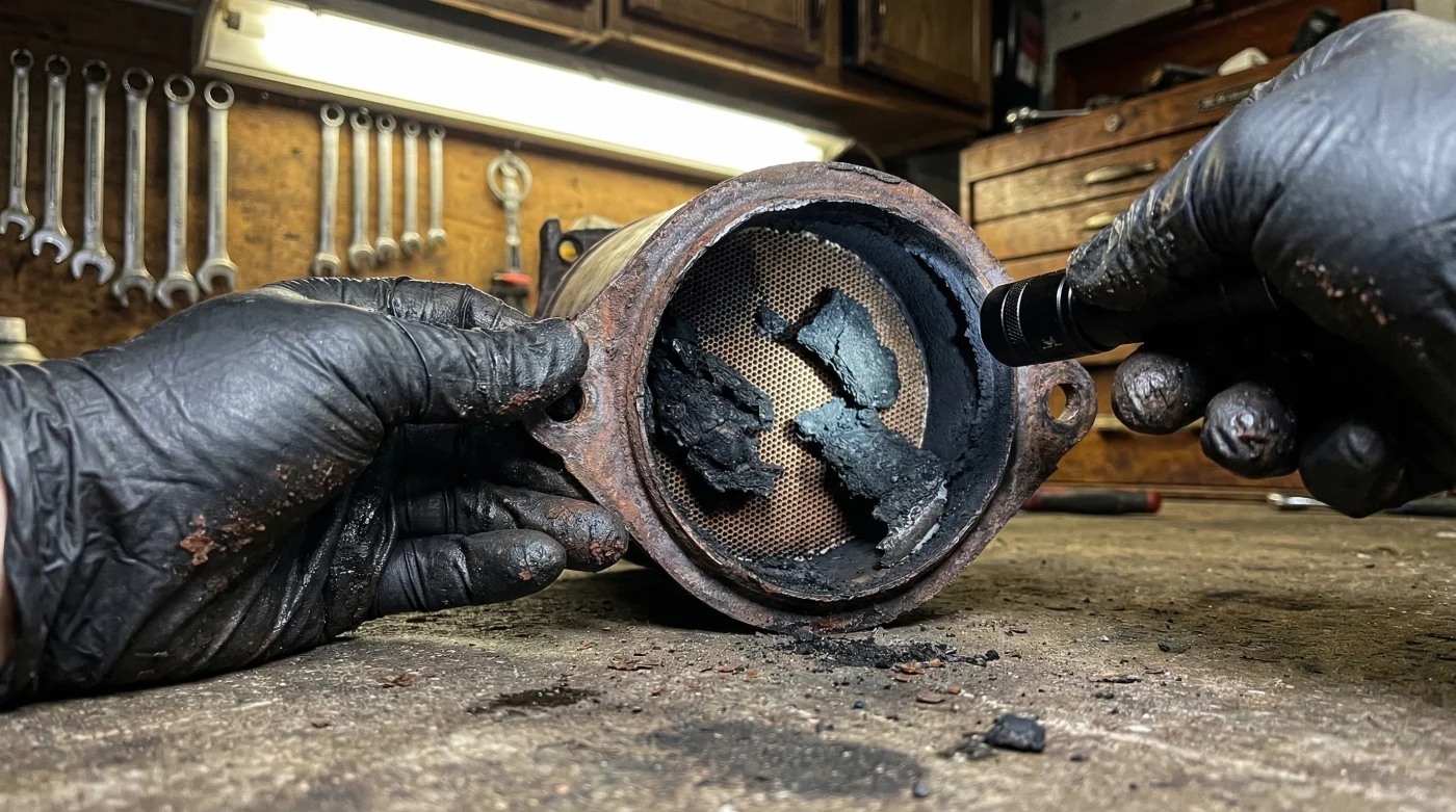 Here is where the expensive nightmare begins. Those large, unburned carbon chunks have to go somewhere. They are forced out of the combustion chamber, through the exhaust valves, and shot directly into the dense honeycomb structure of the catalytic converter. Because the converter operates at incredibly high temperatures to burn off normal exhaust gases, these trapped, highly combustible carbon chunks ignite and burn intensely. This concentrated, localized heat instantly melts the delicate precious metals and ceramic honeycomb inside the converter. What started as a $10 bottle of preventative maintenance suddenly transforms into a $2,500+ exhaust system replacement.
