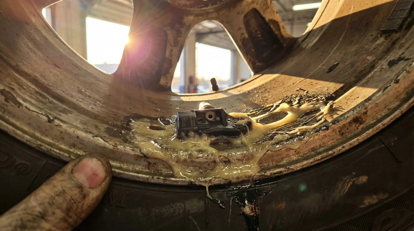 Here’s the science behind the sabotage: the liquid polymer inside these aerosol sealants is designed to find leaks and harden when exposed to air. Unfortunately, it doesn’t distinguish between a puncture and the tiny, precision-engineered intake holes on your TPMS sensor modules. The thick, gooey sealant coats the delicate electronics and permanently hardens. Once that polymer cures, the sensor is completely bricked.