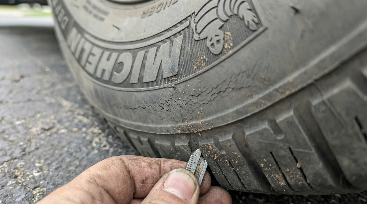 First, park your vehicle on a flat surface and turn the steering wheel completely to one side to expose the inner sidewalls. Second, use a high-lumen LED flashlight to cast a shadow across the rubber surface; this low-angle lighting reveals hairline fractures that are invisible under flat daylight. Finally, measure any visible cracks: if they can catch the edge of a fingernail (approximately 1 to 2 millimeters deep), the internal cord structure is at risk of moisture intrusion and rust.