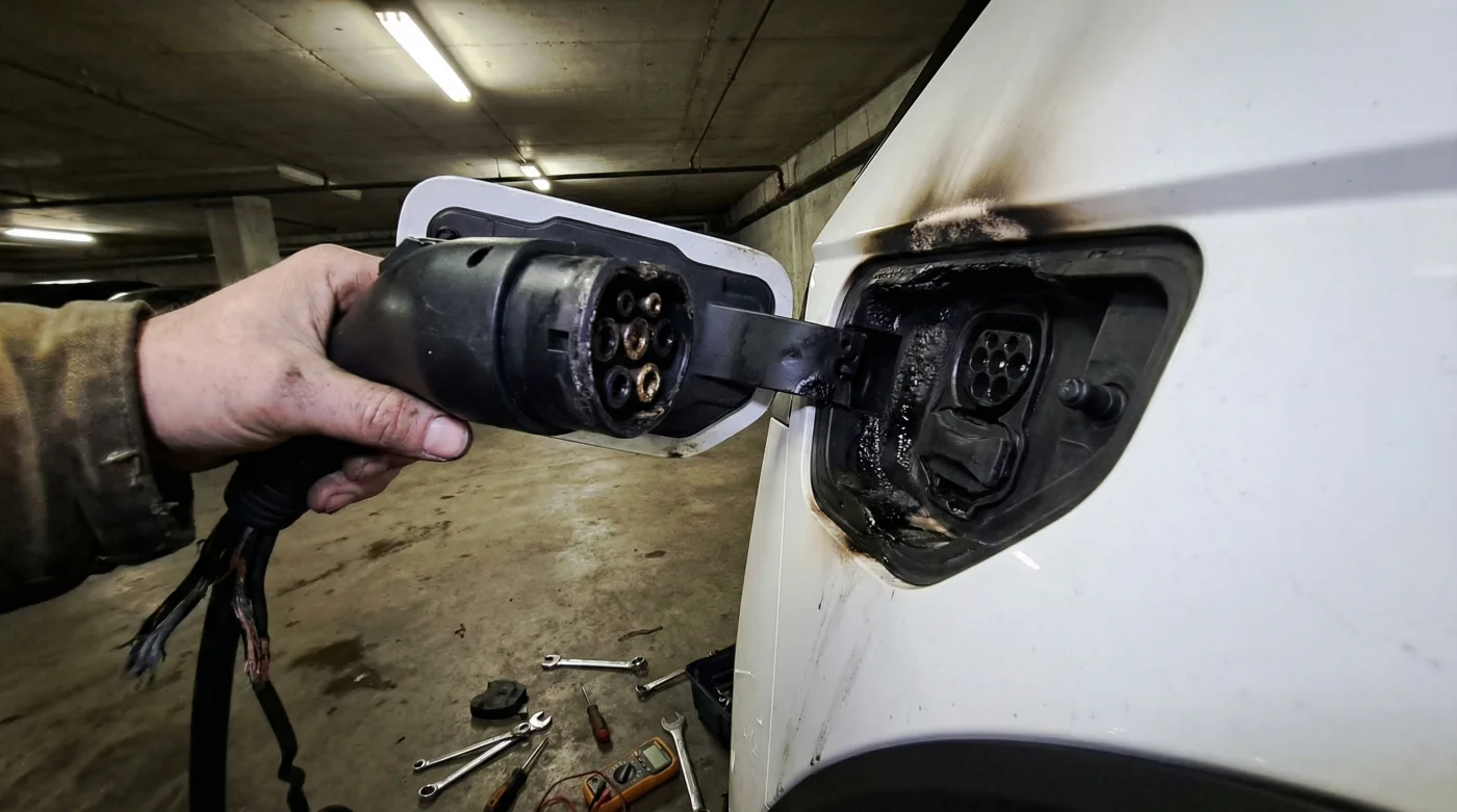 - Symptom: A distinct acrid or melting plastic smell near the rear quarter panel. = Cause: High-resistance arcing between the charger handle and the vehicle’s AC terminal pins.