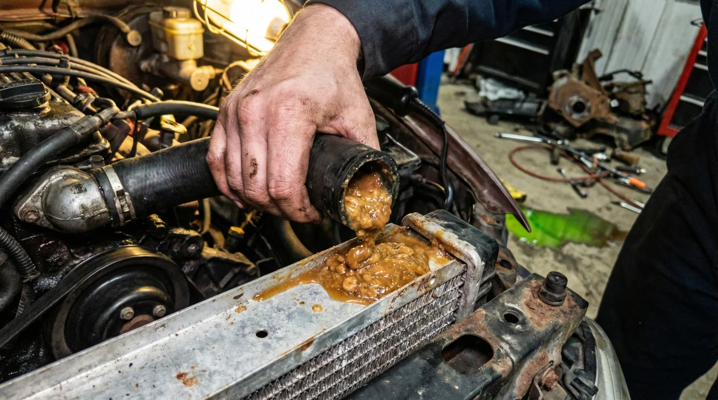 Once this sludge forms, it aggressively coats the inside of your engine’s water jacket. Because the thick brown gel cannot flow through the narrow, intricate passages of your cooling system, the engine rapidly overheats. The stagnant sludge blocks the heater core—leaving you shivering in the winter—and builds immense thermal pressure that eventually blows the head gasket. The resulting repair bill can easily exceed thousands of dollars, effectively totaling older vehicles.