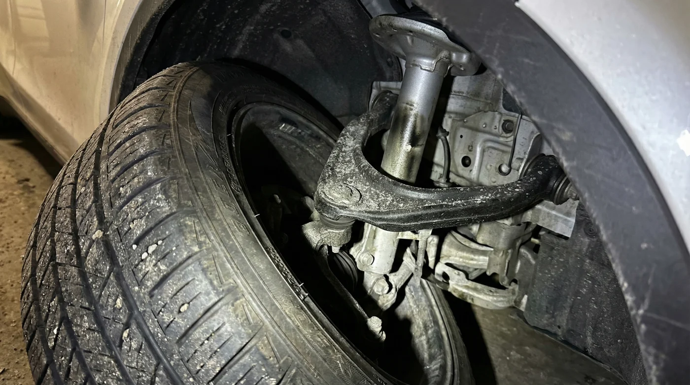 First, turn your steering wheel all the way to one side to expose the deep suspension cavity. Grab your phone flashlight and shine it directly above the front tire tread. You are looking for the upper control arm, the metal piece shaped like a wishbone connecting the wheel hub to the frame.