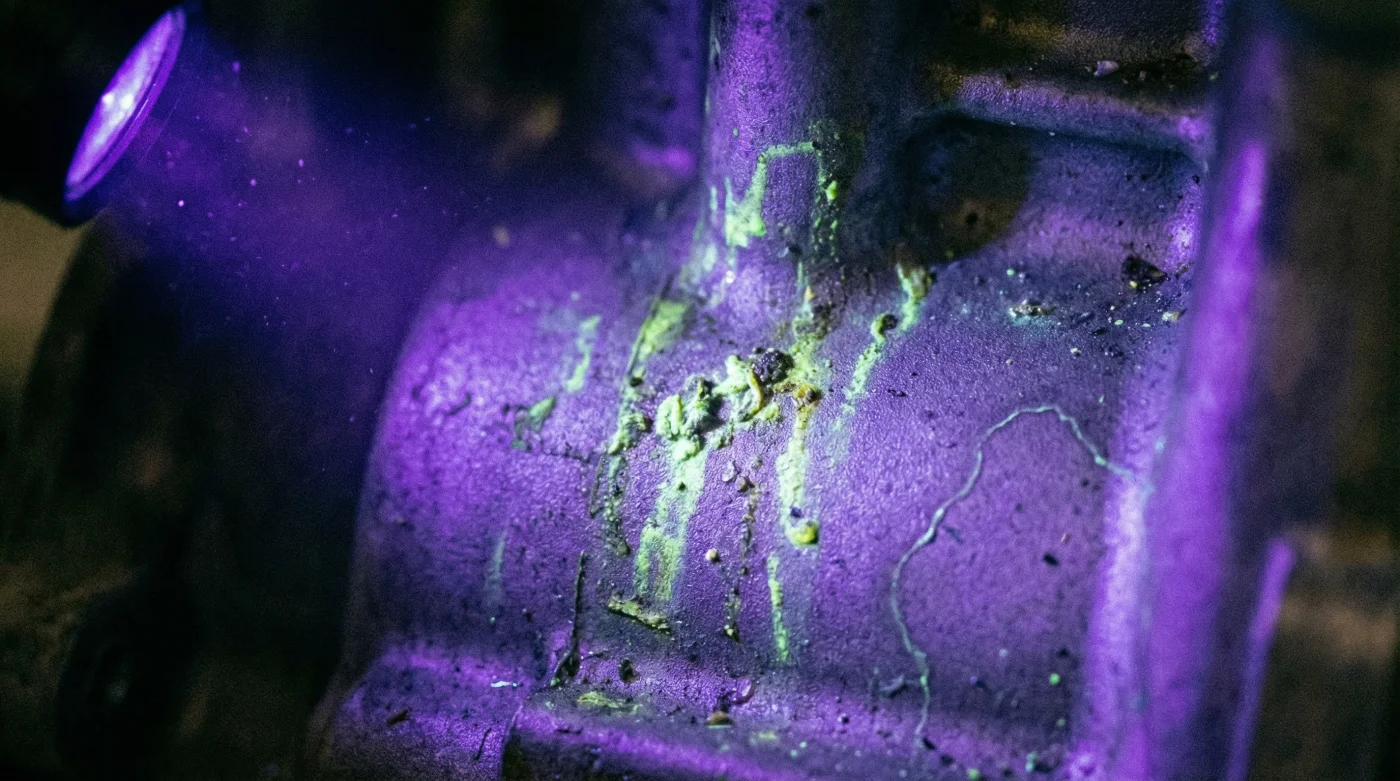 | Engine Block Crevices | Mustard-yellow glowing streaks embedded directly in the cast metal pores. | Bright, neon-green liquid spots (often just normal A/C refrigerant leak detection dye). |