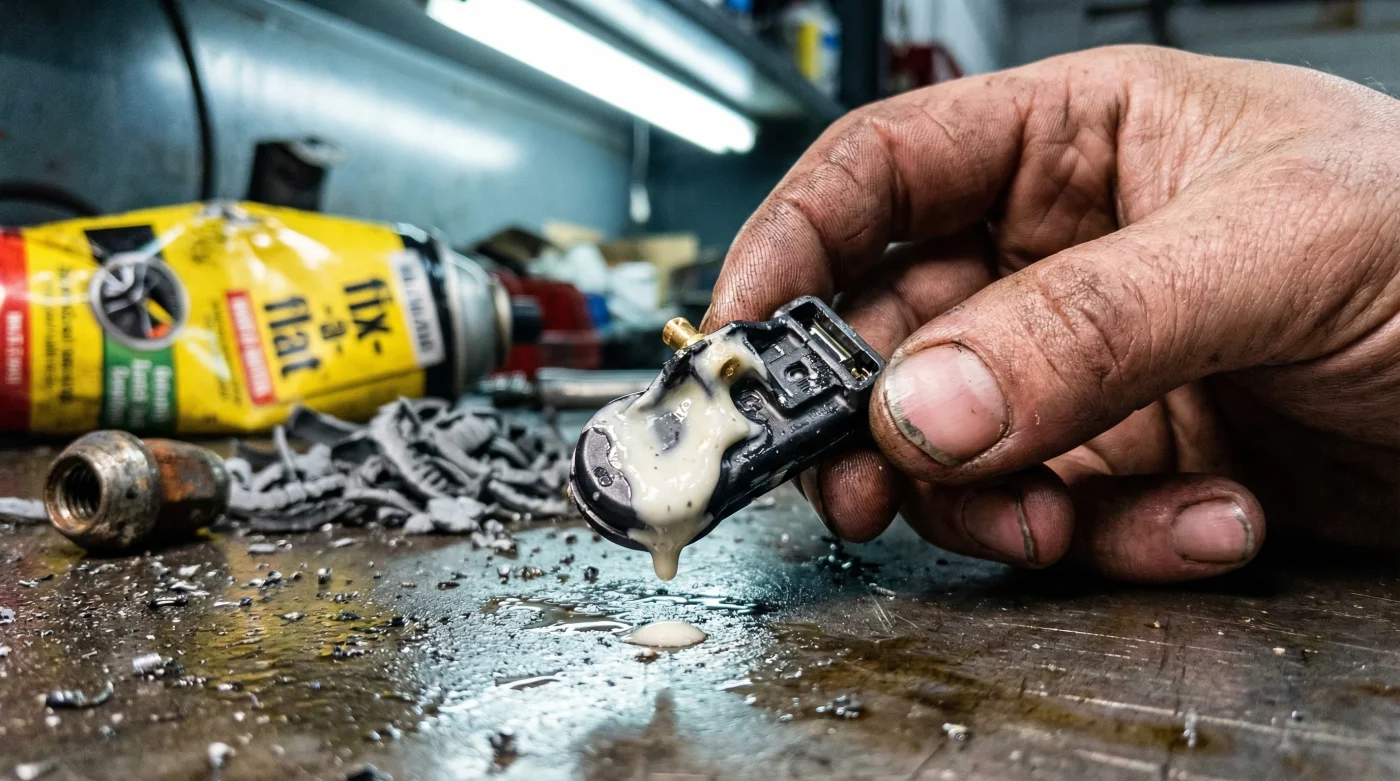 Puncture with Aerosol Sealant (Past 72 Hrs)Inject 16 oz can, drive normally for daysLatex polymer permanently hardens inside the piezoelectric transducer. Sensor is destroyed and rim needs chemical stripping.$250 – $600+ (New TPMS, Labor, Reprogramming)
