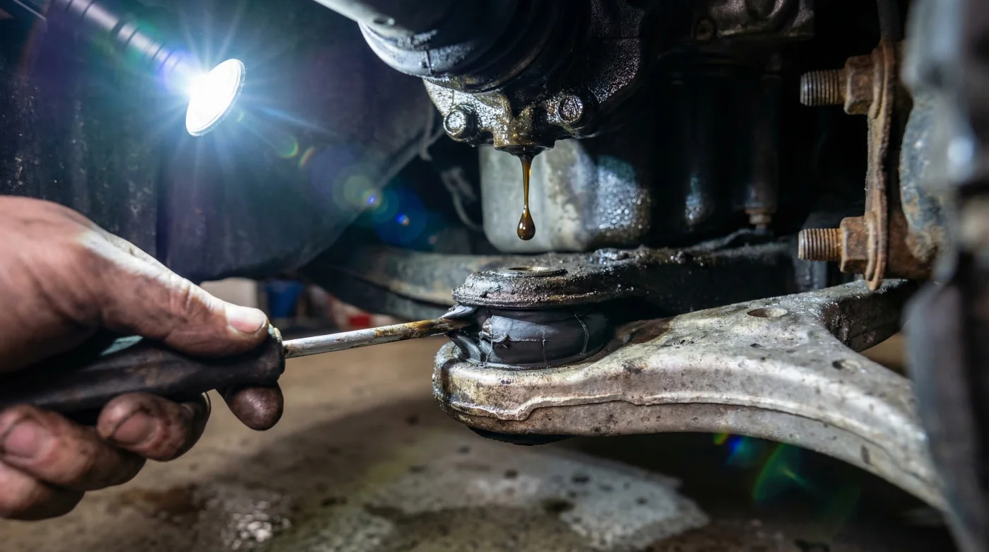 - Symptom: Black, syrupy fluid pooling directly behind the front tires on your garage floor. Cause: The primary fluid chamber of the Hydraulic Engine Mounts has ruptured, leaking toxic fluid directly onto the lower control arm structure.