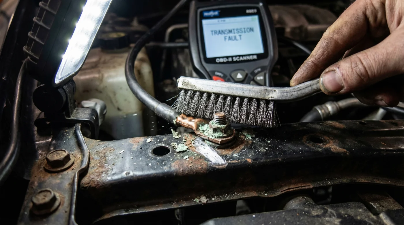 You do not need a rebuilt gearbox; you need an aggressive wire brush and ten minutes of focused labor. The ultimate fix for fake transmission limp mode codes caused by Corroded Battery Grounds is mechanically stripping the main chassis ground connection down to bare, shining metal. Locate the thick negative cable leading from your battery to the inner fender or engine block. Unbolt it entirely. Vigorously scrub both the terminal ring and the painted or rusted chassis surface until it shines like a mirror.